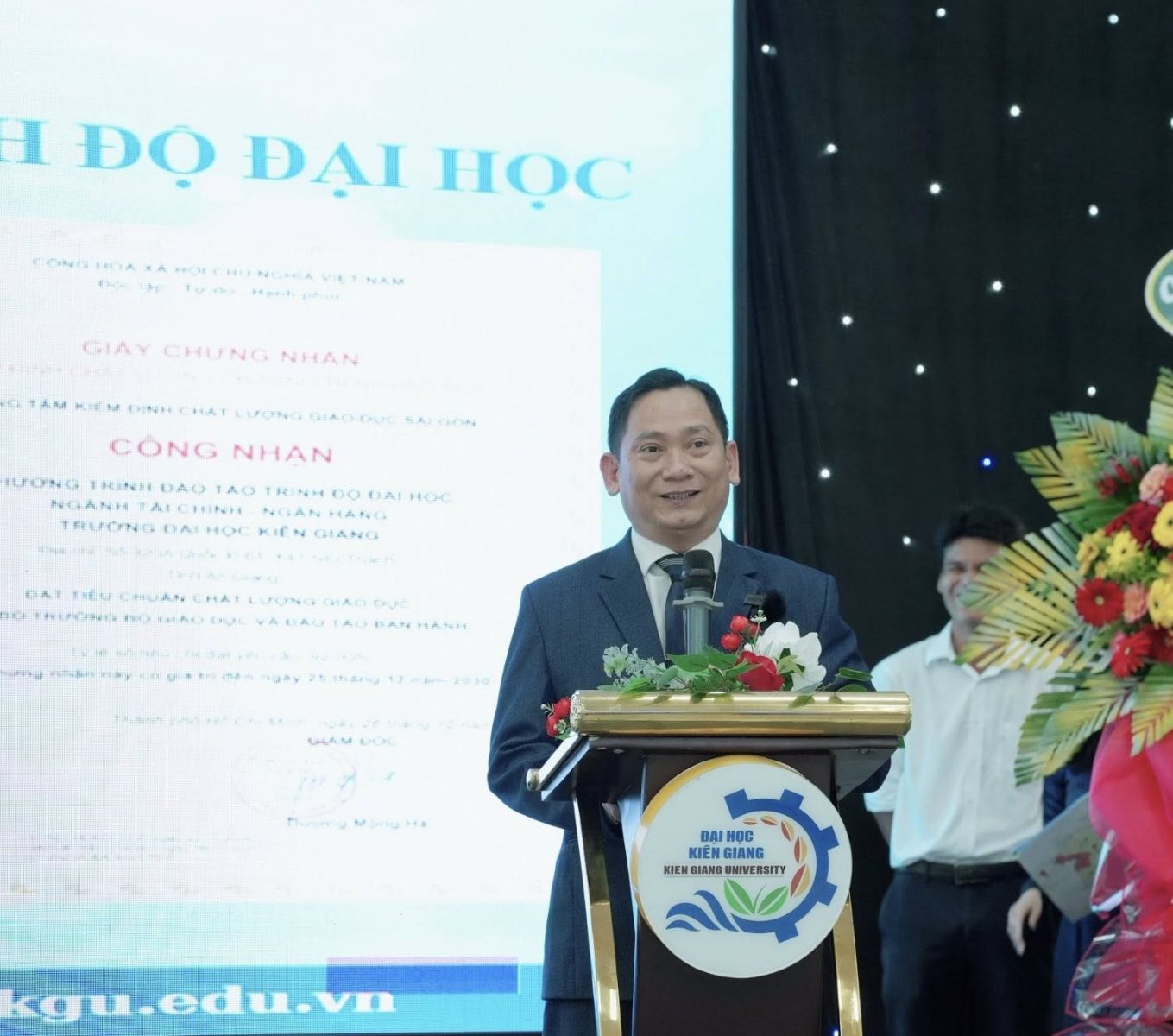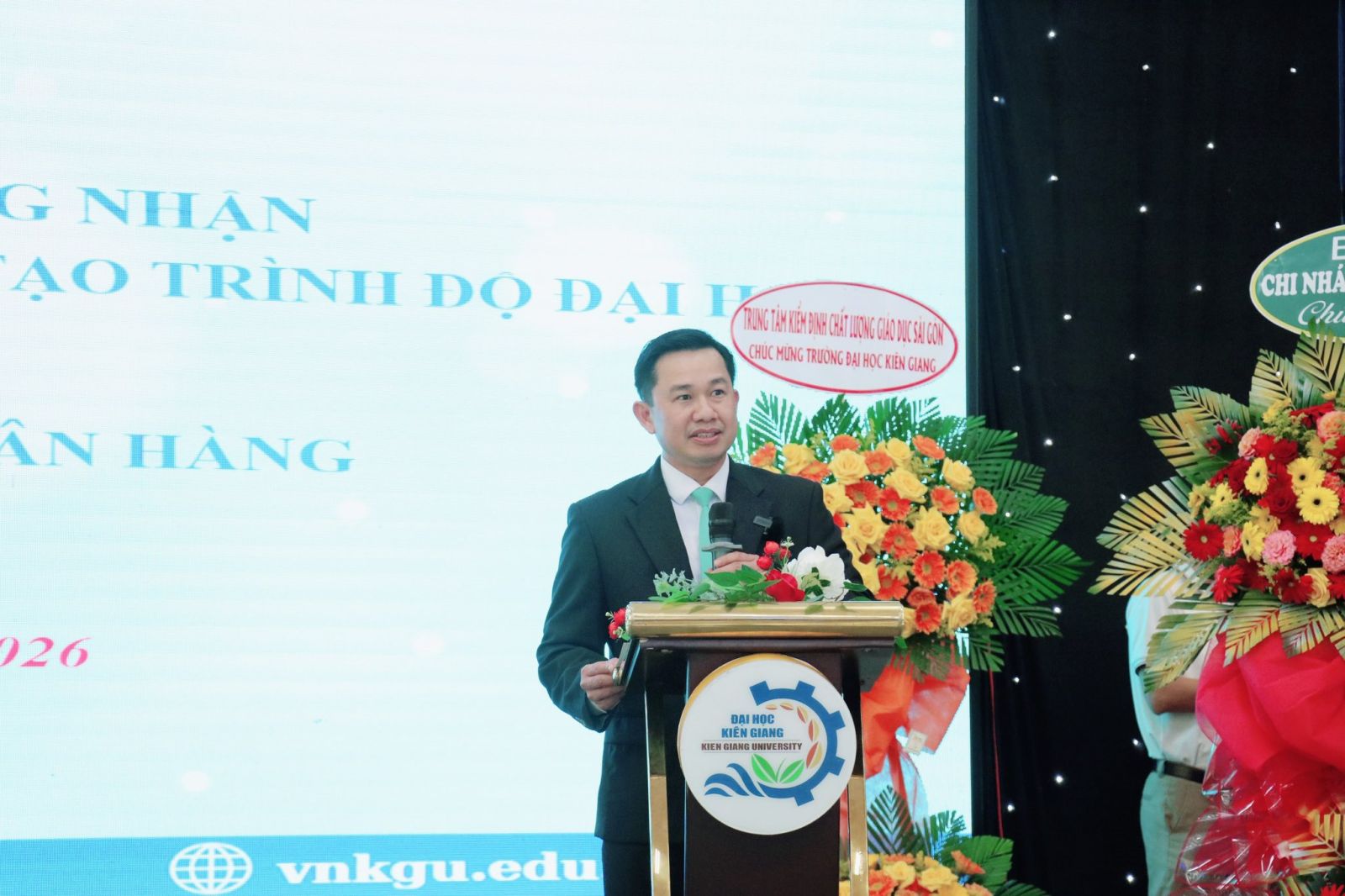 Phát biểu tại buổi lễ, TS. Lê Hoàng Vũ nhấn mạnh, kiểm định chất lượng là yêu cầu tất yếu trong tiến trình đổi mới giáo dục đại học và là thước đo cho sự phát triển bền vững của mỗi cơ sở đào tạo. Ông ghi nhận sự chuẩn bị nghiêm túc, tinh thần trách nhiệm và những nỗ lực không ngừng của Trường Đại học Kiên Giang trong quá trình tự đánh giá và cải tiến chất lượng; đồng thời gửi lời chúc mừng năm mới và chúc mừng Nhà trường có thêm 02 chương trình đạt chuẩn kiểm định.