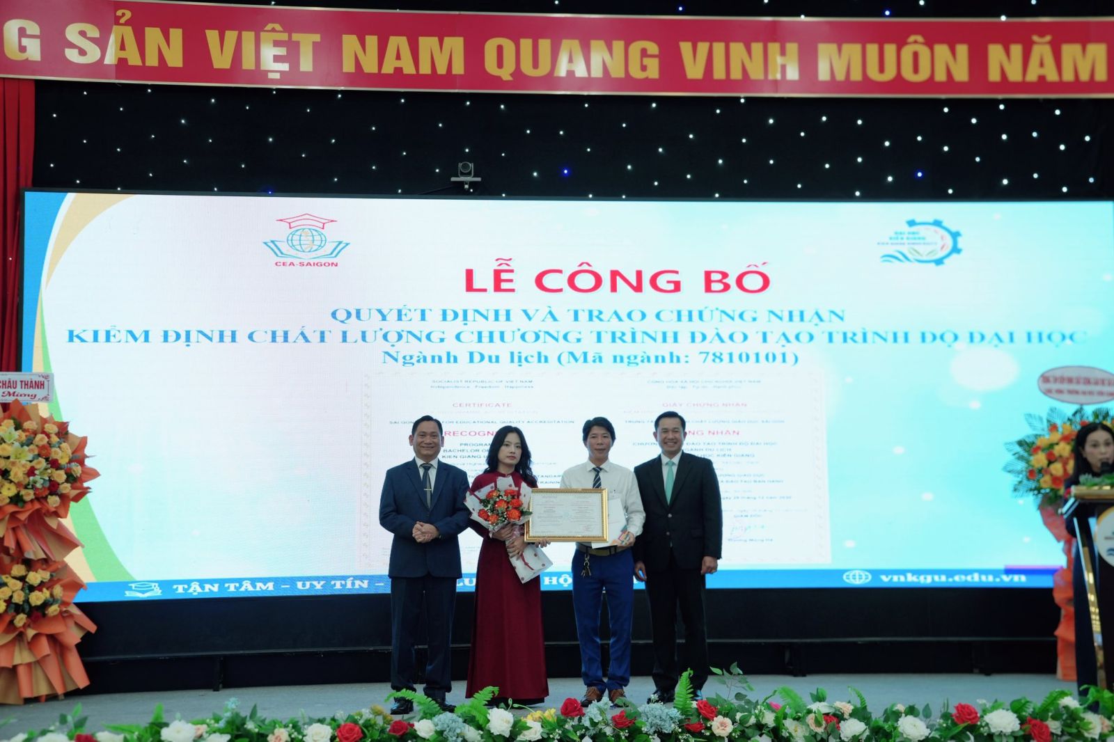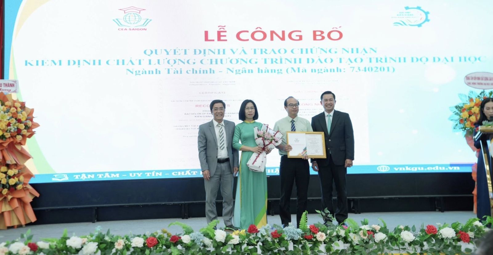Ngày 06/02/2026, Trường Đại học Kiên Giang phối hợp với Trung tâm Kiểm định chất lượng giáo dục Sài Gòn tổ chức Lễ công bố quyết định và trao giấy chứng nhận đạt chuẩn kiểm định chất lượng giáo dục cho 02 chương trình đào tạo trình độ đại học, gồm ngành Du lịch và ngành Tài chính – Ngân hàng.Nâng tổng số chương trình được công nhận đạt chuẩn kiểm định chất lượng giáo dục của Nhà trường lên 12 chương trình. Sự kiện đánh dấu bước phát triển quan trọng trong chiến lược đảm bảo và nâng cao chất lượng đào tạo của Nhà trường.